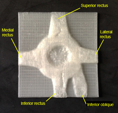 The human anatomy 3D print listed below is shown with and without labels. The original image from which the stereolithography (stl) file was made is Image 57-5 and can be seen at http://lane.stanford.edu/search.html?source=bassett&q=left+eye+muscles#bassett=%2FbassettView.html%3Fbn%3D57-5. Digital photos of the 3D prints were made with light shining on them at an angle to show the lower regions as dark as when sunlight shines on mountains at sunset and the valleys are dark in shadow and the higher regions are still lit as this better shows the 3D nature of a print.