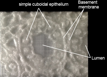 The human tissue 3D prints will be shown with and without labels. The original image from which the stereolithography (stl) file was made will also be shown to give a better sense of the level of accuracy for the 3D prints which can now be used for a tactile learning experience. Digital photos of the 3D prints were made with light shining on them at an angle to show the lower regions as dark as when sunlight shines on mountains at sunset and the valleys are dark in shadow and the higher regions are still lit as this better shows the 3D nature of a print.