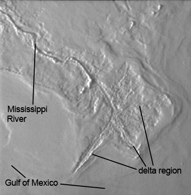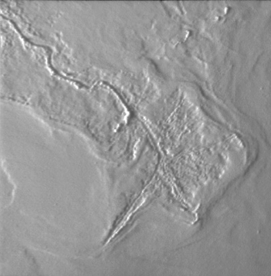 The LandSat image listed below is shown with and without labels and are from whitefish blastula cells. The original image from which the stereolithographic (stl) file was made is also shown to give a better sense of the level of accuracy for the 3D prints which can now be use for a tactile learning experience. Digital photos of the 3D prints were made with light shining on them at an angle to show the lower regions as dark as when sunlight shines on mountains at sunset and the valleys are dark in shadow and the higher regions are still lit as this better shows the 3D nature of a print.