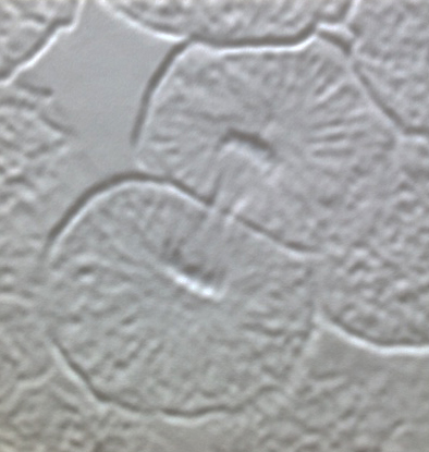 The cell in telophase is shown below with and without labels. The original image from which the stereolithographic (stl) file was made is also shown to give a better sense of the level of accuracy for the 3D prints which can now be use for a tactile learning experience. Digital photos of the 3D prints were made with light shining on them at an angle to show the lower regions as dark as when sunlight shines on mountains at sunset and the valleys are dark in shadow and the higher regions are still lit as this better shows the 3D nature of a print.